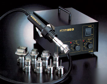 NEW SMT SMD HOT AIR REWORK SOLDER STATION 8502 + 9 TIPs For sale is a brand new, improved Model of the original 8502 2-in-1 hot aire soldering/rework station, a must-have for anyone that needs a workhorse for surface or hole mount components. With QUAKKO 700, you get a temperature controlled solder station and rework station in one compact and convenient setup. You also get a sharp-tip regular soldering iron for fine pitch chips, and 9 nozzles (instead of the 8 nozzles for the old 8502 model) for surface mount components (see pictures for more details). We will also throw in the pick up tool for free! We also carry extra nozzles, please email us for more information or check out other items for sale. With the hot air output of this unit, you can perform surface mount rework in seconds, without damage to either components or PC boards. Just screw a nozzle onto the hot air tool, place the nozzle over the QFP, SOP, PLCC or SOJ to be desoldered, apply hot air to melt the solder without ever touching the component or PC board, and gently lift the component from the board using the included pick up wires. Soldering of the replacement SMD is just as easy. Other applications include thermal testing of electronic components, shrink-wrapping protective packaging, and welding thermoplastics. Station is made of metal and coated with a static-dissipative paint, so it's totally ESD-safe. (New smt smd hot air rework solder station 8502 + 9 tips was posted and is owned by: Ronald Gardner) |