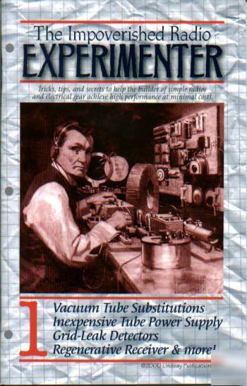 bounce, yer money order will get lost in the mail and yer dog won't come home. click on our "Contact Us" icon above for the quickest response to your questions. THE IMPOVERISHED RADIO EXPERIMENTER SET 4 VOL THE IMPOVERISHED RADIO EXPERIMENTER SET 4 VOL THE IMPOVERISHED RADIO EXPERIMENTER SET 4 VOL THE IMPOVERISHED RADIO EXPERIMENTER SET 4 VOL THE IMPOVERISHED RADIO EXPERIMENTER SET 4 VOL THE IMPOVERISHED RADIO EXPERIMENTER SET 4 VOL THE IMPOVERISHED RADIO EXPERIMENTER SET 4 VOL THE IMPOVERISHED RADIO EXPERIMENTER SET 4 VOL THE IMPOVERISHED RADIO EXPERIMENTER SET 4 VOL THE IMPOVERISHED RADIO EXPERIMENTER SET 4 VOL THE IMPOVERISHED RADIO EXPERIMENTER SET 4 VOL Here's the full set of all 4 Volumes of the 'ol wire stripper's Impoverished Radio Experimenter Series. These booklets proved so popular it just made sense to offer the whole set in one money saving lot. THE IMPOVERISHED RADIO EXPERIMENTER VOL. 1 Tricks, tips and secrets to help the builder of simple radios and electrical gear achive high performance at mininal cost! Experimenter's notes on Vacuum Tube Substitutions, Inexpensive Tube Power Supply, Grid-Leak Detectors. Regenerative Receiver and more! You must try building a simple radio with tubes! It's easy, and it's cheap. (And don't tell me that doesn't appeal to you...) Do you remember the excitement when you built your first crystal set? This is even better! You also get details on a crystal set that was converted to a grid-leak radio. You'll get details on how various tubes worked in the circuit. You get pages of tube charts and basing diagrams, a reprint on tube theory from 1931, a bibliography of research papers from the late 20's, and you get a brief demonstration of a one-tube regenerative receiver built with a 6SN 7 glass tube from the 1950's (had to scrape the mud off it) using a circuit from 1927. It uses a home-made variable capacitor and the home-made power supply described. Early radio circuits are simple. You don't HAVE to use the exact parts specified. Mix, match, substitute and, above all, do it on the cheap. Old time radio fun for pennies. That's what it's about. Add this to your reference library. Soft cover 5 1/2" X 8 1 /2" booklet 48 pages well illustrated. THE IMPOVERISHED RADIO EXPERIMENTER VOL. 2 Tricks, tips and secrets to help the builder of simple radios and electrical gear achive high performance at mininal cost! Building radios (and transmitters and antenna-tuners if you have a ham radio license) is about matching the proper capacitors with the proper coils to get a desired frequency. You can wind a coil and hook it up to a capacitor, but how will you know if it's right? A grid-dip oscillator, or gdo, is a measurement device that will tell you. And it's very simple - first used in the 1920's. You'll learn to use the gdo along with simple formulas that will put your tank circuits on the frequencies you want. You can use other formulas along with a known coil or capacitor to measure the value of an unknown coil or capacitor. In other words, for a radio builder, you gotta have a volt-ohmmeter and gdo. Other-wise, you're just wasting valuable time. You'll learn how to take a pentagrid converter tube and build a one-tube shortwave converter that will put shortwave broadcast stations on a frequency that an ordinary AM radio, or crystal set for that matter, can receive. While your crystal set buddies are listening to some talk show idiot on the AM band, you can be listening to a talk show idiot on the other side of the world on 5 or 10 mHz! And you can listen to the reasonable BBC out of London, or stations in Canada, Germany, Belgium, China, Cuba (talk about BS!) and elsewhere. It's powered with the simple power supply built in The Improvished Experimenter Vol. 1. You'll learn how to make a top rate slow-motion dial drive for your radio. Its 7.5 to 1 ratio makes tuning stations easy. You'll find that it works far better than many expensive antique dial drives. It's easy! You'll learn how to make a simple rig for winding professional hi-Q space wound coils. It's easy and low-cost. You get many more hints, tips, and ideas for exploration. Some people prefer to whine that they can't find parts. It can be a problem, but geez... in the time it takes to whine, you can build your own parts! Valuable info and it's Cheap! Soft cover 5 1/2" X 8 1 /2" booklet 48 pages well ilustrated. The Impoverished Radio Experimenter How to build an impedience bridge and more from the 'ol wire stripper hisself, Tom Lindsay. The circuit is simple, in use for 70 years, and is remarkably accurate. It's like a crystal ball that looks inside mysterious inductors and capacitors and gives you a good idea of what they are. You can't build much of anything, mechanical or electrical, unless you have useful measuring tools. The first part of this new volume shows you how to build a simple impedance bridge that will allow you to measure inductors and capacitors to two significant digits. That means that if you find an old choke in a radio chassis in the alley, this will tell you whether it is 2.5 henries or 17 henries. This bridge will tell you if that old paper capacitor you removed from the underside is still .01 mfd or has changed. Not only can you test old commercial parts of unknown value, you can also build your own capacitors and inductors (see Voice of the Crystal) and measure the results. Then you can intelligently use the parts to build all kinds of radio gear. The bridge needs an audio tone. If you have a simple audio oscillator, you're set. But if not, you'll find plans for a simple one IC oscillator that will put out a 150-1500 cycle tone. Use it on the bridge or for other tests. And you need a pair of earphones to listen to the tone inside the bridge circuit as you make bridge adjustments. A pair of 2000 ohm headphones is best, but you'll get plans for another very simple one IC amplifier that will make a pair of low-impedance of "Walkman" type headphones, available almost anywhere,