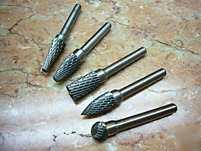 The shape and sizes as below (from top to bottom) traditional tree - 2 1/2" (65mm) total length and 1" (25mm) working length ball nosed tree - 2 3/8" (60mm) total length and 3/4" (20mm) working length cylindrical w/ end cut - 2 3/8" (60mm) total length and 3/4" (20mm) working length pointed tree - 2 3/8" (60mm) total length and 3/4" (20mm) working length spherical - 2" (50mm) total length (5 pcs 10MM tungsten carbide rotary burr set 1/4" shank was posted and is owned by: Mildred Thompson) |