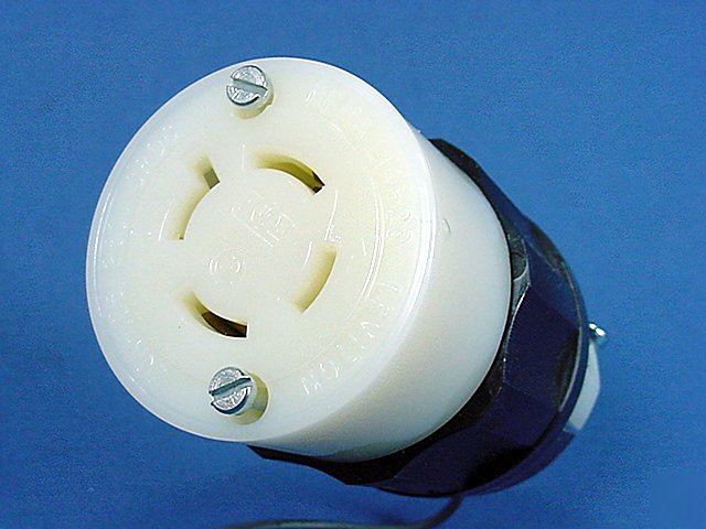 Leviton 2413 locking connector. Industrial Specification Grade, NEMA L14-20R, 3-pole, 4-wire, grounding, rated 20A 125/250V. Cord grip range: .595"-.895". Terminals accomodate #18-#10 AWG. Leviton's Industrial Grade locking plugs, connectors, and receptacles are definitely a step above the rest in quality. Each is individually packaged; packaging may differ from photo. Features include: Click here to see matching L14-20 plugs, connectors & receptacles. This is New Old Stock and is returnable for any reason. (SKU #L2413-EA; 0.40 Pounds) (Leviton L14-20 locking connector plug 20A 125/250V was posted and is owned by: Jana Mayo) |