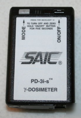 PD-3i-s Electronic Gamma Radiation Dosimeter Used, in excellent condition, SAIC PD-3i-s Electronic Dosimeter Last calibration 1/28/2009. Removed from a facility that closed. The following information is from the manufacturers website: "The PD-3i-s personal dosimeter is a pager-sized device that monitors gamma dose rate and cumulative dose and sounds an alarm when limits are exceeded. Overview: The PD-3i-s pager is a self-reading electronic radiation dosimeter that offers personal dose and dose rate monitoring in a rugged, lightweight package. Applications: The PD-3i-s measures photon radiation and provides dose measurement, dose rate measurement, and chirp alarms. The system offers the user improved monitoring while reducing the interference and annoyance of larger, more cumbersome electronic dosimeters currently available. Features: The PD-3i-s offers features such as: Benefits: The PD Family of Dosimetry Products are produced by SAIC and are built with operational realities in mind." (Saic pd-3I-s electronic gamma radiation dosimeter was posted and is owned by: Martin Salazar) |